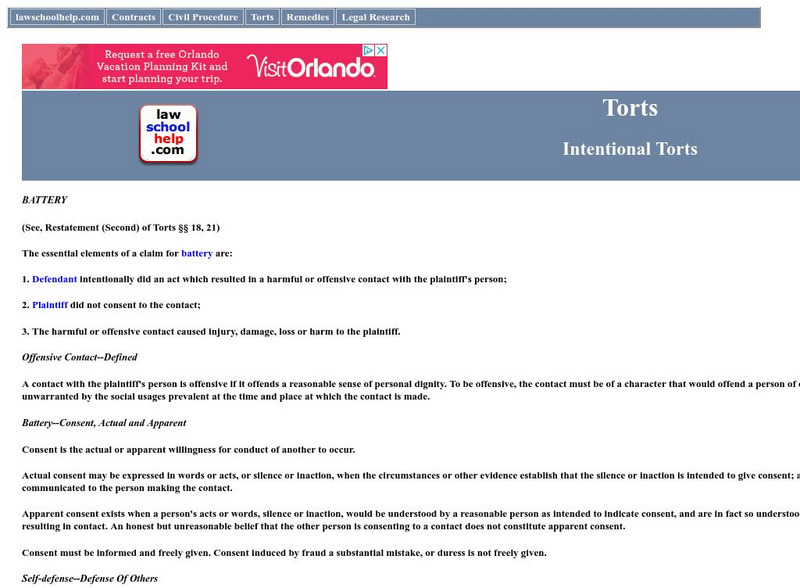 This website lists and describes different types of "Intentional interference with person or property": battery, offensive contact, false imprisonment, abuse of process, and breach of contract.