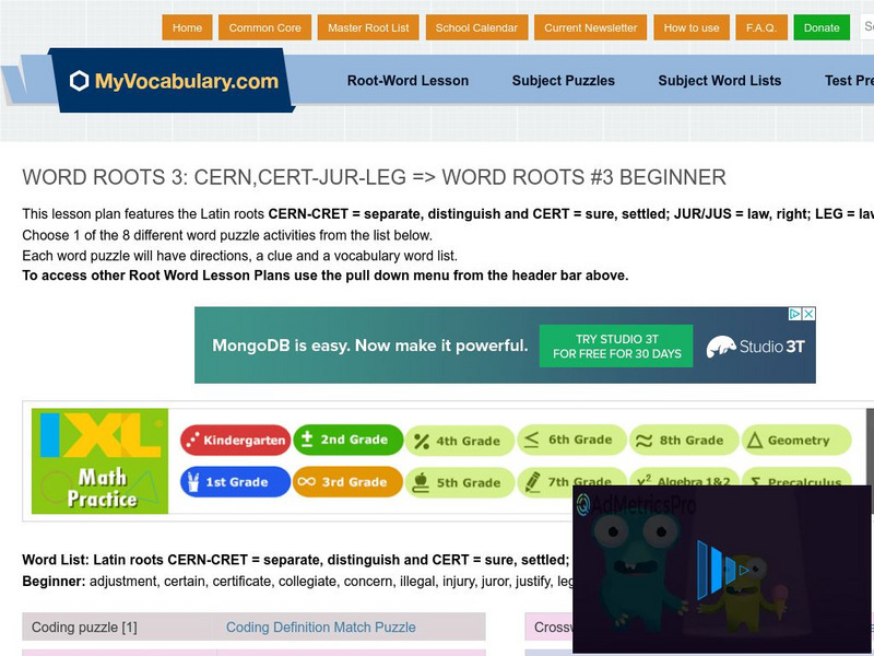 MyVocabulary.com features three levels of words for each root; this fill-in-the-blanks quiz contains a word bank of beginner vocabulary containing the roots cern/cer/cre, jur/jus, and leg. You can print it out, or your learners can take...