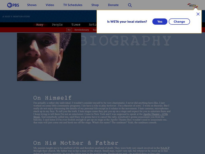 This page contains a biography of Huey Newton, founder of the Black Panthers. The biography includes these sections: on himself, on his mothe and father, on being a criminal, on his name, on his principles.