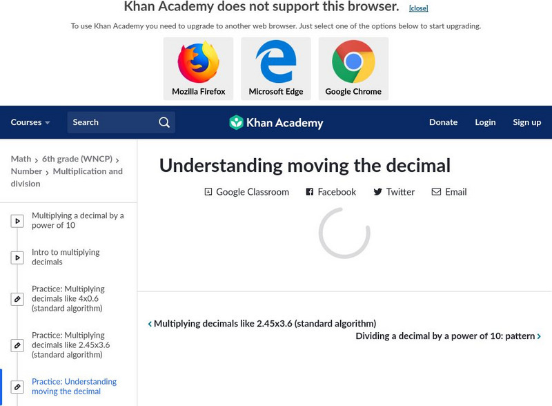In this exercise, students practice understanding moving the decimal when multiplying or dividing by 10. Students receive immediate feedback and have the opportunity to get hints and try questions repeatedly.