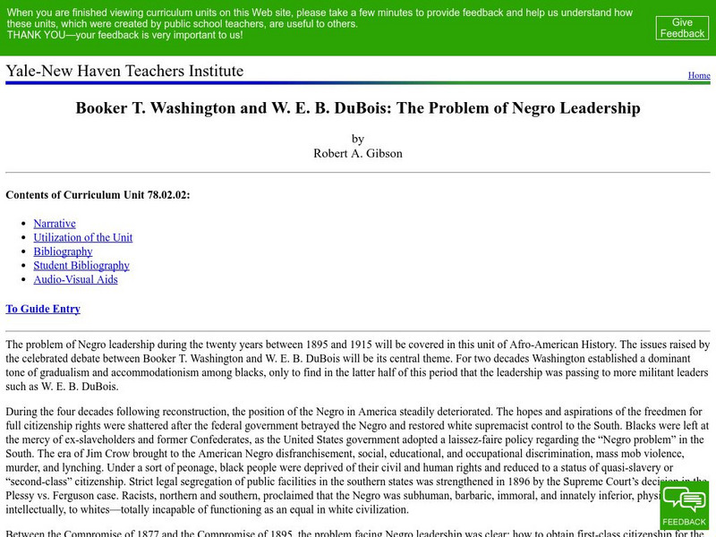 The site is a discussion of "Negro leadership" during the end of the 19th century and the beginning of the 20th century. Booker T. Washington and W.E.B. Dubois and their influence are covered in detail.