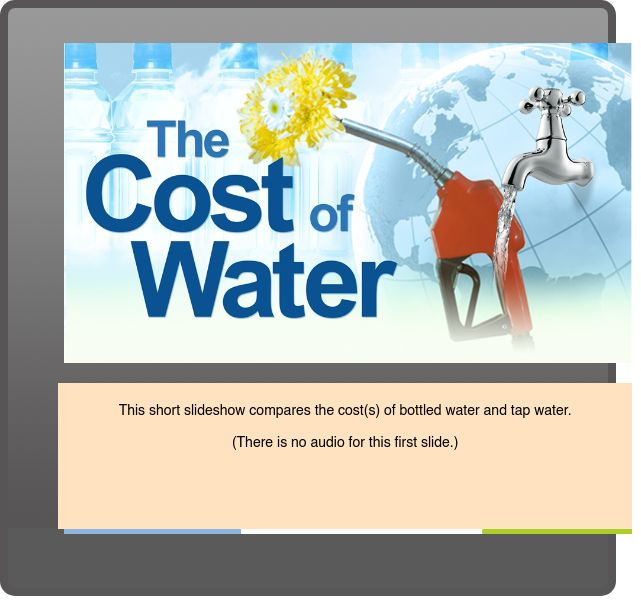 A slideshow explaining and illustrating the cost of water in plastic bottles compared to water straight from the tap. Find the differences. Which one is more expensive?