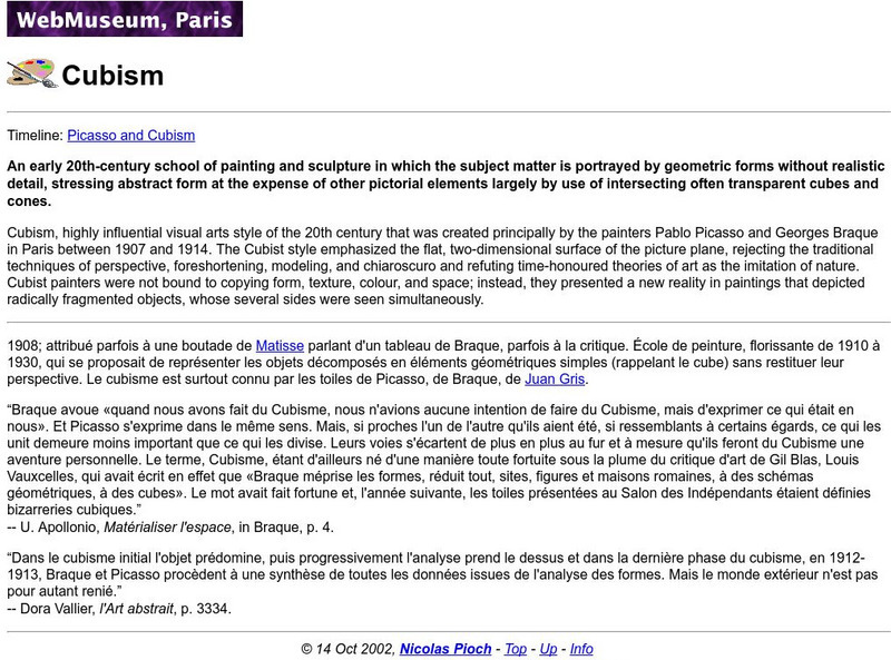 Brief and concise description from ibiblio.org of Cubism and one related artist, Picasso, with additional links to Picasso and Cubism.