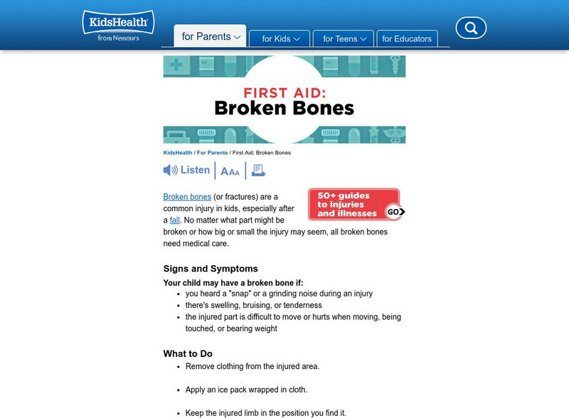 What happens when you break a bone or get a strain or sprain? Find the answer at this website, and also find instruction sheets on first-aid care for broken bones, strains, and sprains.