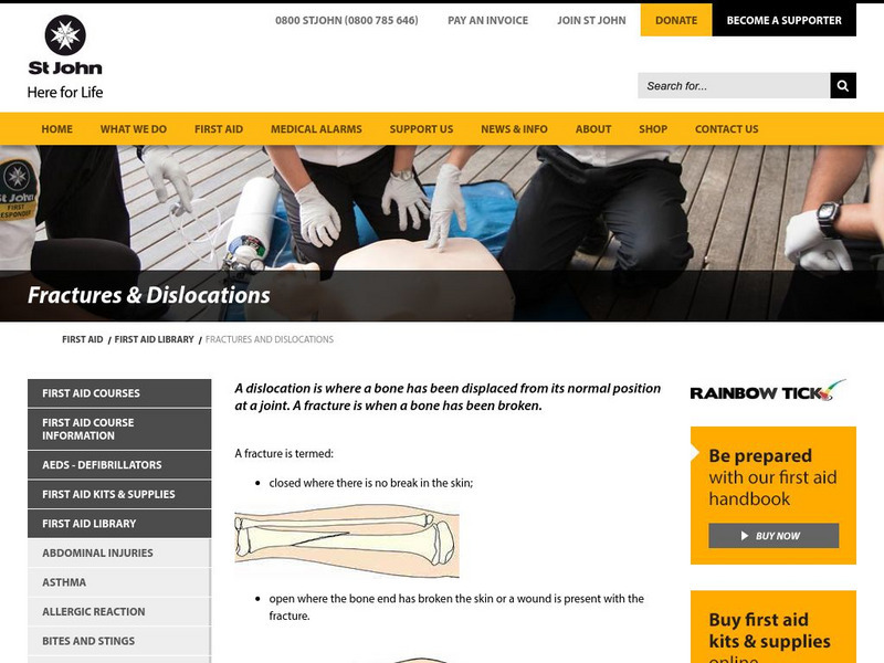 Taken from the pages of the "St. John First Aid Manual," this is a good resource for learning about fractures and their symptoms, and how to take care of them in an emergency situation. Provides definitions of "Closed fracture," "Open...