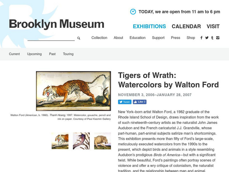 This long-term exhibition, "Tigers of Wrath" watercolors by Walton Ford was on view in 2006 at the Brooklyn Museum. This page takes you into the exhibition with images of selected works from the exhibit as well as a teachers packet for...
