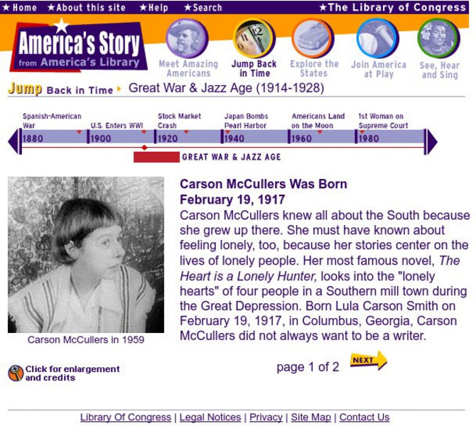 This resource provides information about and images of the writer Carson McCullers (1917-1967), author of The Heart is a Lonely Hunter, Reflections in a Golden Eye, The Member of the Wedding, and other works.