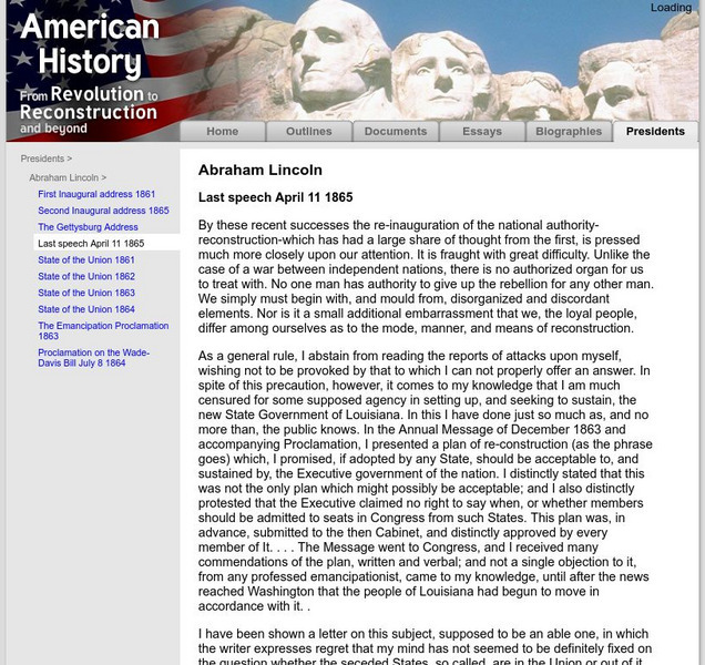 This American History site provides the text of Abraham Lincoln's last speech given on April 11, 1865.