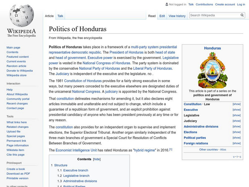 This encyclopedia entry features a discussion of the politics of Honduras including information about the current security situation and the branches of government.