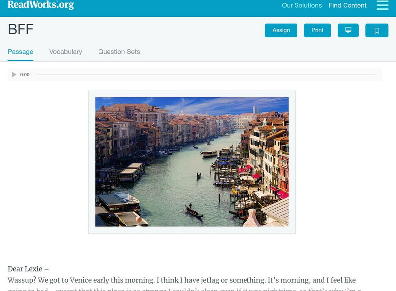 [Free Registration/Login Required] A literary text between two girls who are best friends, but one is vacationing with her family in Venice. A question sheet is available to help students build skills in reading comprehension.
