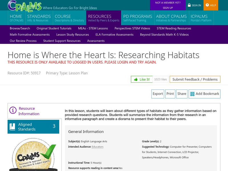 [Free Registration/Login Required] In this lesson, students will learn about different types of habitats as they gather information based on provided research questions. Students will summarize the information from their research in an...