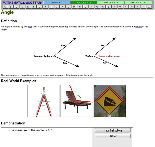 Get a visual and animated definition of the term "angle" from LearnAlberta.ca's Mathematics Glossary.