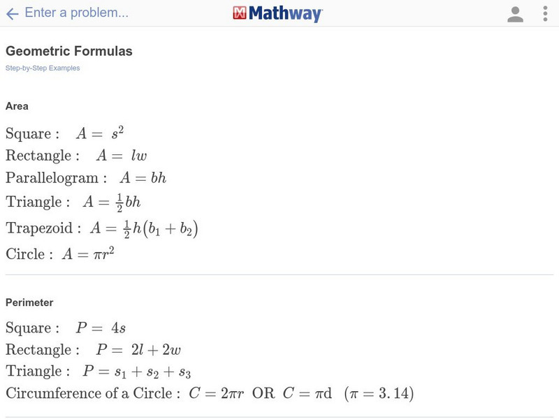 Resource provides geometric formulas for area, perimeter, surface area, and volume.