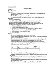 Students examine why some objects float while others do not. They place various objects in water to observe their floating capability. Students record the object, its weight, and if the object floated. They construct a graph plotting...