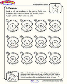 In this in between 26 and 61 worksheet, students color all of the numbers that come between 26 and 61 yellow and all other numbers pink. Students have 12 numbers to color.