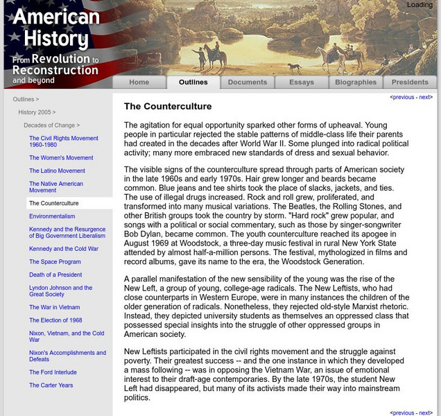 Section overview on the Counterculture and anti-war movement of the late 1960s and early 1970s and its impact on a new social and political order.