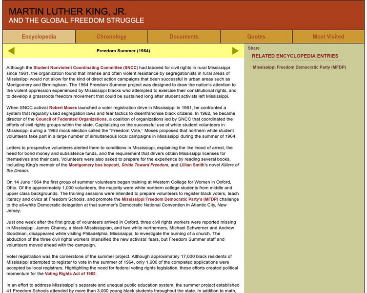 Take a look at Mississippi in the early 1960s to understand why the focus of African American voter registration targeted that state. Read about the organization and implementation of the Mississippi Summer Project in 1964. See also the...