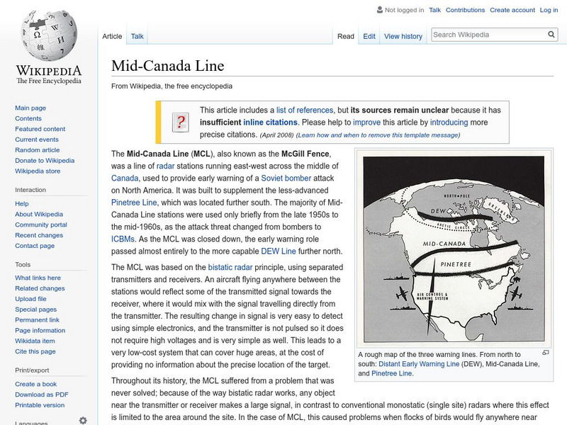 A concise description of the Mid-Canada Line of radar stations. Covers history of this early-warning system that was in place in the 1950s and 1960s, a list of the locations and a list of the POL Supply Points that provided fuel to the...