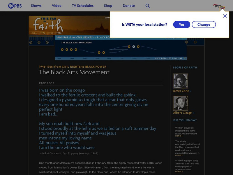 From PBS this is "The Black Arts Movement" as part of the series "This Far by Faith", which examines the role of faith in the civil rights cultural movement from the 1940s through 1960s in the U.S..