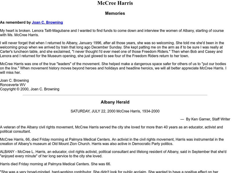 Biographical sketch of McCree Harris, upon her death, which describes her involvement in the Civil Rights Movement of the 1960s in Albany.