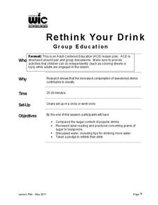 Students examine the sugar content of common beverages. In this adult health lesson, students convert grams of sugar to teaspoons. They discuss the benefits of drinking water instead of soda and juices.