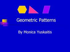 Geometric patterns illuminate this colorful and interactive PowerPoint. First, patterns must be identified. Next, students discern the missing color in a block pattern. Lastly, they observe a figure to determine how many blocks are used....