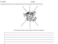 In this learning about adjectives worksheet, students read a page that describes the use of adjectives as describing words. They underline the adjectives in 8 sentences, and write 2 sentences that describe the creature that is pictured...