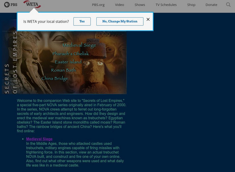 NOVA ferrets out long-forgotten secrets of architects and engineers of the early civilizations. Content focuses on the trebuchets of medieval Europe, the pharaoh's obelisks of ancient Egypt, the moai statues of Easter Island, the...