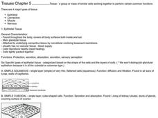 In this tissue worksheet, students are given notes on 6 types of epithelial tissues, 10 examples of connective tissue, three types of muscular tissue and the components of nerve tissue.