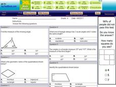 Are your geometry whizzes learning about angles and shapes? This online worksheet gives 10 multiple choice questions based on images and word problems. Concepts include deducting angle degree, classifying shapes, and identifying angle...