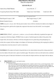 Sixth graders examine the history and growth of the religion of Islam. They copy the notes as the teacher writes an outline of text chapters on the board, compare and contrast Christianity with Islam, and participate in a class discussion.