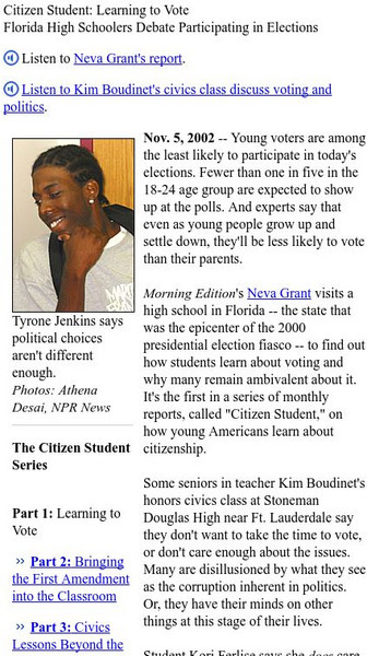A multi-part NPR program on the views of students about civic participation. Part 1 discusses Voting, Part 2 discusses "Bringing the First Amendment into the Classroom," and Part 3 talks about the strong messages teenagers have grown up...