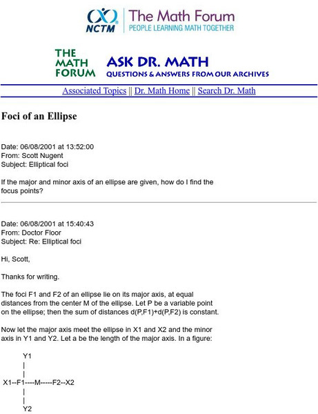 The question, "If the major and minor axis of an ellipse are given, how do I find the focus points?" is answered at the Math Forum.