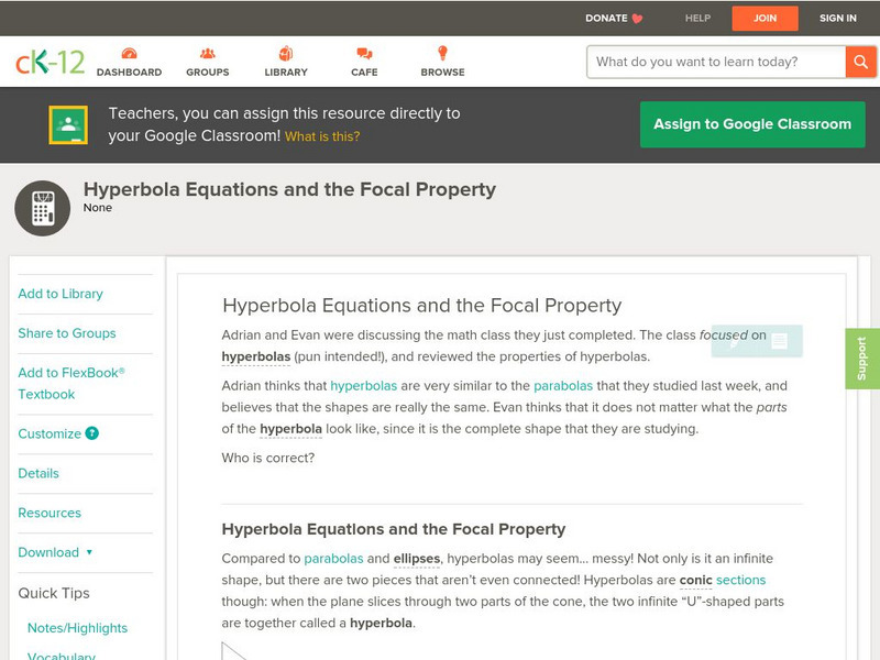 [Free Registration/Login may be required to access all resource tools.] In this lesson students learn about the asymptotes of hyperbolas. Students examine guided notes, review guided practice, watch instructional videos and attempt...