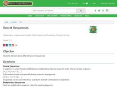 Learners analyze number sense by participating in a pattern identification activity. In this number sequence lesson, students examine several groups of numbers and identify the sequence in the group before adding on to it. Learners check...