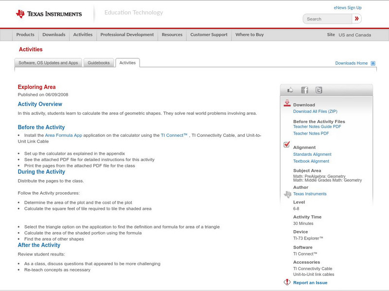 In this activity, students learn to calculate the area of geometric shapes. They solve real world problems involving area.