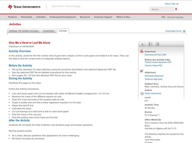 In this activity, students' find the surface area of geometric shapes cut from card paper and relate it to its mass. They use this data to find the surface area of irregularly shaped objects.