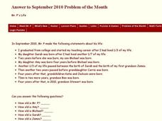 With only indirect information, can your mathematicians figure out how old Mr. P is? This secondary mathematics worksheet has algebra students examining 9 pieces of information about Mr. P's life, each of which is integral to answering...