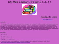 Students participate in a instructional activity that reinforces reading skills. Specifically, this instructional activity focuses on the skill of summarization. This strategy teaches students how to better comprehend written text.