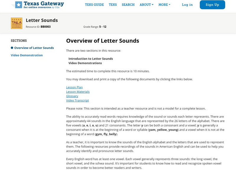 This Overview of Letter Sounds resource has two sections: Introduction to Letter Sounds and Video Demonstrations. It provides downloads of the following: lesson plan, lesson materials, glossary, and video transcript. This section is...
