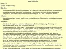 Students investigate what discrimination is and study Article 2 from the Universal Declaration of Human Rights. They participate in a role play activity involving majority and minority groups for which a letter was sent home to parents....