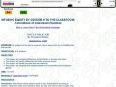 Students discuss the traditional roles of men and women at home and in the working world. In this gender lesson, students observe someone who holds a job usually thought to be held by one gender. Students direct their...