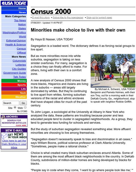Intriguing article explaining the trend illustrated through the 2000 Census information that minorities have broken segregation ties but still choose to live in areas with other members of their racial background.