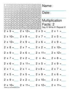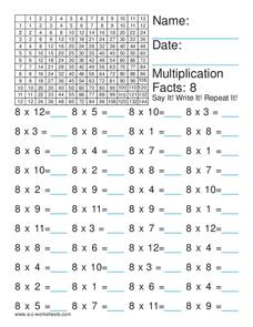 For this multiplication facts worksheet, students complete a total of 100 problems, using facts from 1-81, no zeros. Link to additional worksheets included.