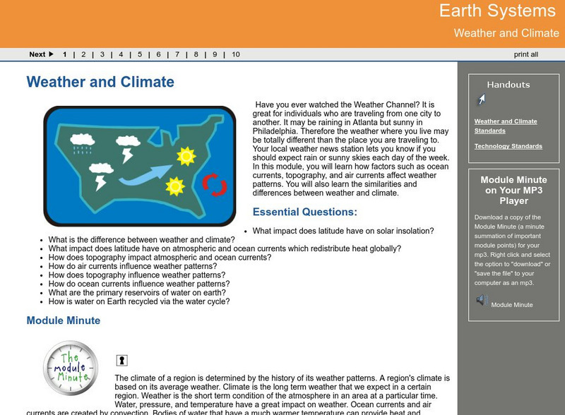 In this amazingly comprehensive interactive tutorial you will learn how factors such as ocean currents, topography, and air currents affect weather patterns. You will also learn the similarities and differences between weather and climate.