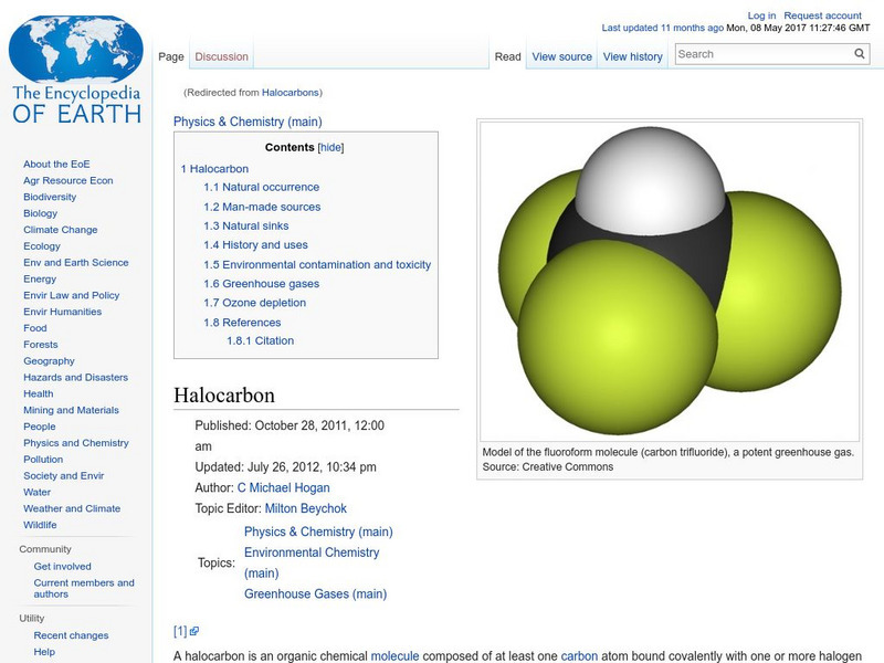 Article explaining what halocarbons are, where they occur in nature as well as man-made sources, how they are used, and their negative environmental impact. (Published: October 28, 2011)