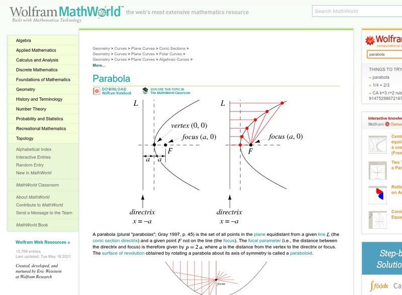 This is a brief lesson on the parabola. The lesson also has links to related topics.