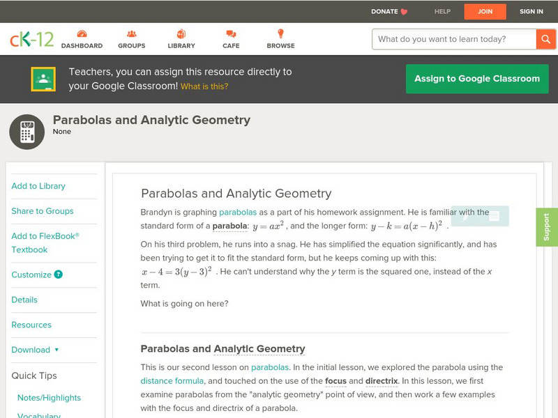 Ck 12: Analysis: Parabolas and the Distance Formula