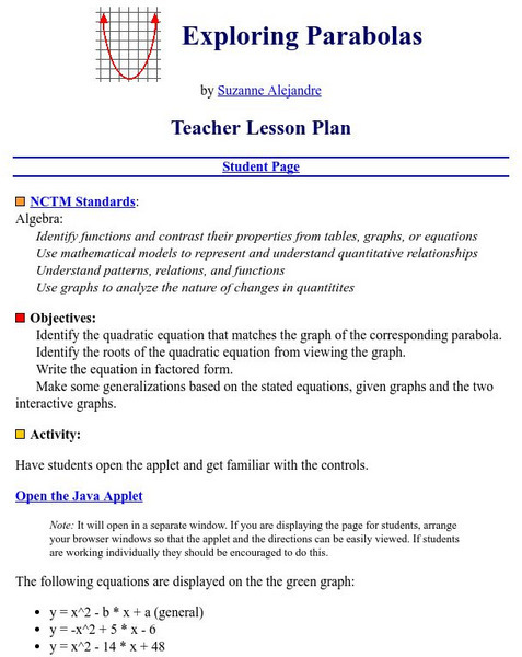 A lesson plan using the computers to help students understand the various forms of equations of parabola. The site requires students to use the computer and offers a possible assessment of the instructional activity.