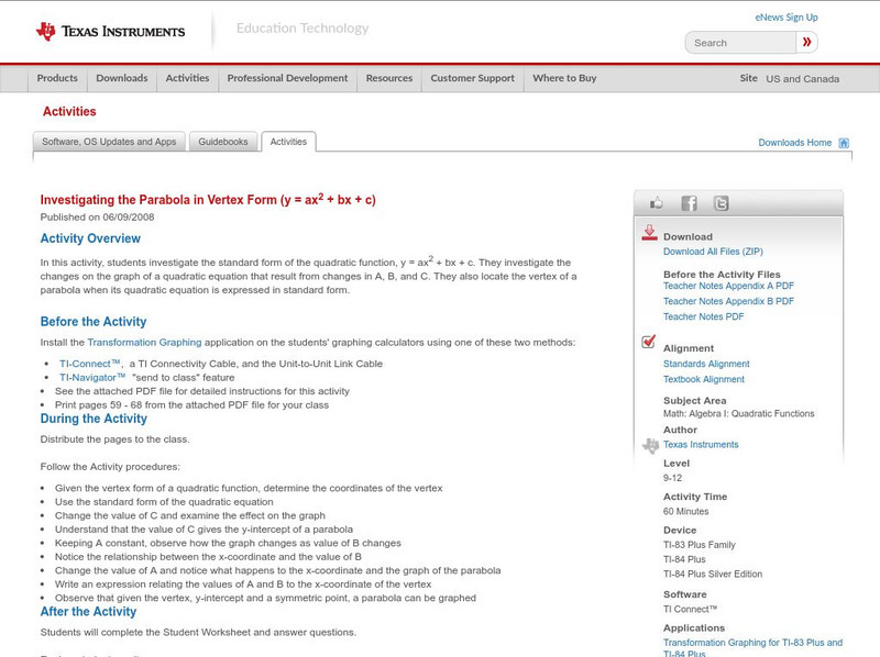 Texas Instruments: Investigating the Parabola in Vertex Form (Y = Ax2